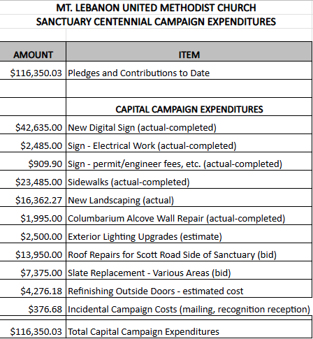 Work on our Capital Campaign projects was deferred during the winter months. When the weather warms, work on the roof and lighting of the front of our church will commence. In addition, we have decided to use the additional funds that were raised to refurbish as many outside doors as funding allows. The first doors to be refurbished are the ones at the entrance to Asbury Center. The doors on Scott Road also need attention so we hope we will have enough funds to complete that project. Finally, we are anxious to see our new landscaping in full bloom this spring. It is interesting to note that our new sign has caught the attention of another Pittsburgh church, and they are interested in installing a similar sign.